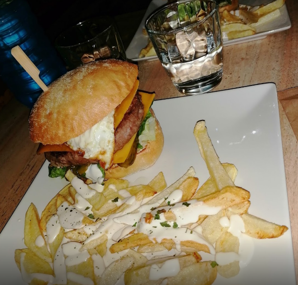 Lechuga, pepinillos, queso chédar, cebolla caramelizada, huevo frito con bollo de pan recién horneado. Acompañada de patatas fritas caseras y cubiertas de salsa de la casa.